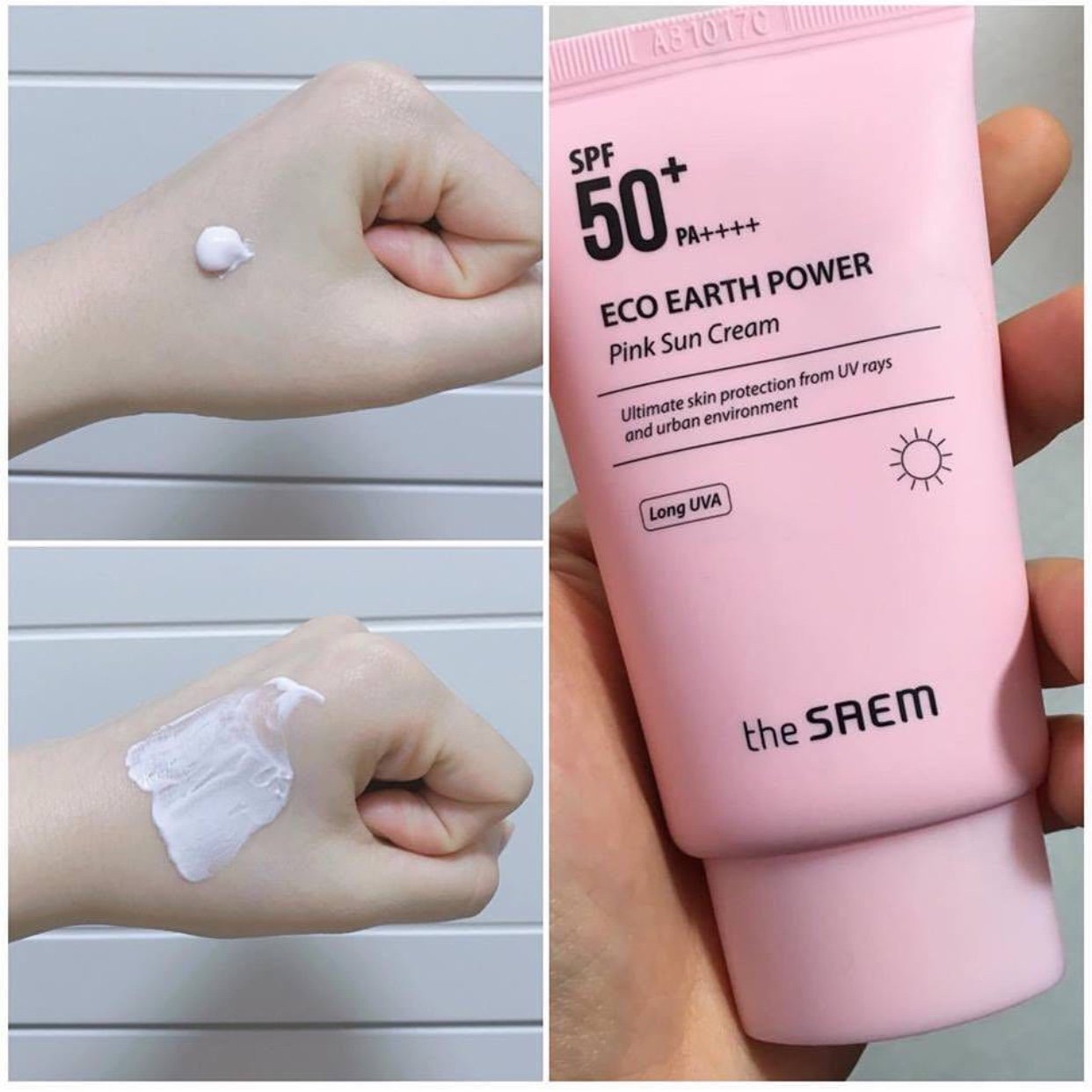 - Kem chống nắng The Saem Eco Earth Power Pink Sun Cream là một trong những dòng sản phẩm chăm sóc da đến từ thương hiệu The Saem của Hàn Quốc giúp bảo vệ 100% làn da khỏi tia cực tím và làm dịu da trước ánh nắng mặt trời.