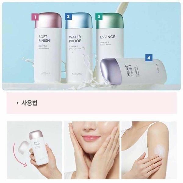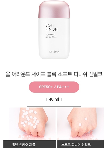 Một trong những loại kem chống nắng nổi tiếng nhất của Missha. Missha All-around Safe Block Soft Finish Sun Milk với ứng dụng công nghệ 2 lớp Double layer chống tia Uv mới, giúp hình thành chống nắng mạnh mẽ và bền vững hơn. Hiệu ứng nâng tông da một cách tự nhiên, giúp da trở nên rạng rỡ và hồng hào. Đồng thời giúp ổn định và giảm độ bống nhờn, mang lại cảm giác mỏng nhẹ dù bôi lại nhiều lần.