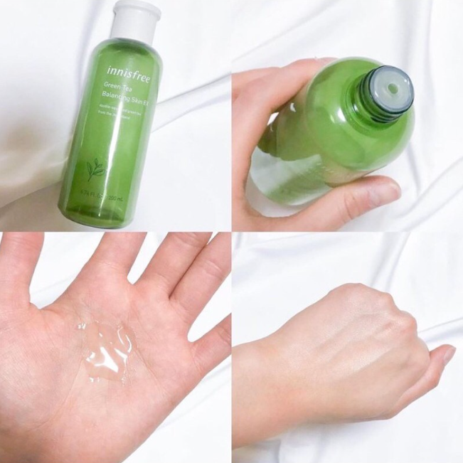 - Innisfree Green Tea Balancing Skin thích hợp cho da hỗn hợp, da hỗn hợp dầu, da bị kích ứng với ô nhiễm môi trường, da có mụn ẩn . Có khả năng làm sạch sâu, tái tạo mới làn da, làm sáng da, chống oxy hóa và ngăn ngừa mụn, viêm hiệu quả.
