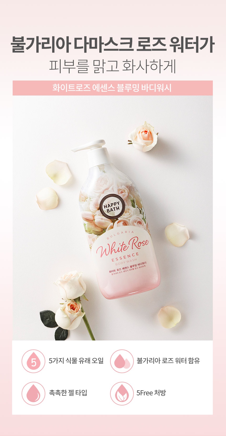 - Sữa Tắm Dưỡng Ẩm Và Sáng Da Chiết Xuất Hoa Hồng Happy Bath White Rose Essence chiết xuất từ các thành phần trong tự nhiên giúp làm sạch da, loại bỏ tế bào chết, bụi bẩn, bã nhờn bám trên bề mặt da, cho làn da láng sạch và lỗ chân lông thông thoáng. Đặc biệt, sản phẩm còn giúp duy trì độ ẩm cần thiết để da luôn mịn màng, mềm mại và lưu lại trên da hương thơm ngọt mát, thư giãn.